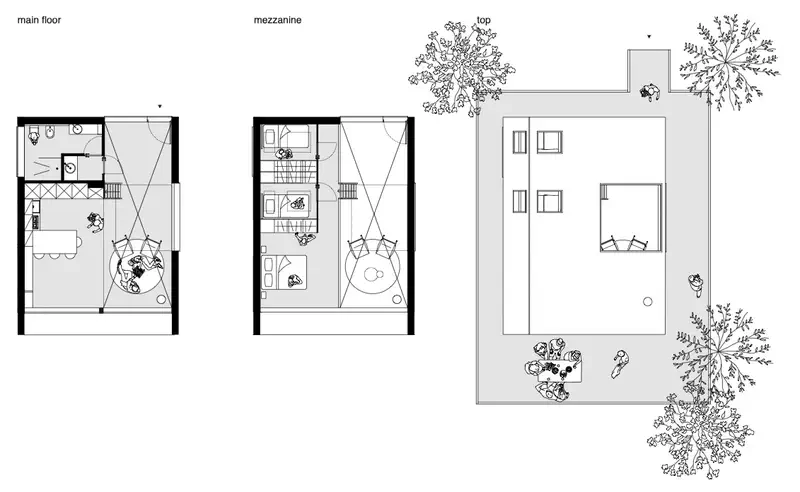 A large living room is divided by furnishing accessories and creates a reading area, a sitting area and a dining room, where we find a kitchen with peninsula. There is a small hidden warehouse and a bathroom on the main floor. On the upper floor there is a hallway that leads to the master bedroom with a see-through access. The room has an open walk-in closet and a private bathroom. The mezzanine structure of the night spaces is open to the living area. From the hallway there is access to an outdoor area with terrace, where it is possible to have a barbeque with friends or simply enjoy the green space created in a very noisy and polluted city.